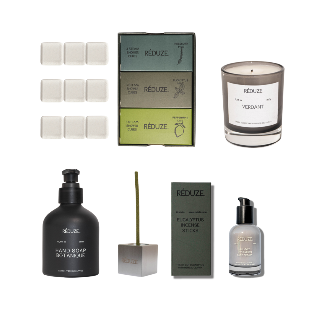1x 9er Set Steam Shower Cubes The Stress Relief & Relax Edit, 1x Duftkerze Verdant 200g, 1x Botanique Hand Soap, 1x Räucherstäbchenhalter aus gebürstetem Edelstahl, 1x Eukalyptus Incense Sticks,1x All-Day Hydration Face Cream