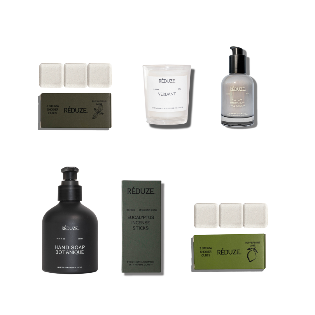 1x 3er Set Steam Shower Cubes Eukalyptus & Minze, 1x 3er Set Steam Shower Cubes Pfefferminze & Limette, 1x Eukalyptus Incense Sticks, 1x Duftkerze Verdant 60g, 1x All-Day Hydration Face Cream, 1x Botanique Hand Soap